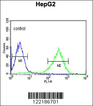 HFE2 Antibody (C-term) (Cat. AMM05341G) flow cytometric analysis of HepG2 cells (right histogram) compared to a negative control cell (left histogram).FITC-conjugated goat-anti-rabbit secondary antibodies were used for the analysis. |