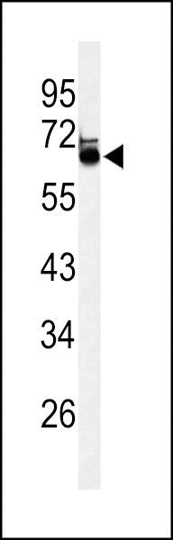 Western blot analysis of LRRTM1 Antibody (Center) (Cat. APR12474G) in mouse brain tissue lysates (35ug/lane). LRRTM1 (arrow) was detected using the purified Pab.