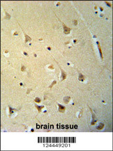 P2R3C Antibody (N-term) (Cat. APR12643G) immunohistochemistry analysis in formalin fixed and paraffin embedded human brain tissue followed by peroxidase conjugation of the secondary antibody and DAB staining. This data demonstrates the use of the P2R3C Antibody (N-term) for immunohistochemistry. Clinical relevance has not been evaluated. |
