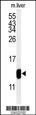 Western blot analysis of TMIE Antibody (Center) (Cat. APR13758G) in mouse liver tissue lysates (35ug/lane). TMIE (arrow) was detected using the purified Pab. |