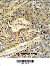 ATP5A1 Antibody (C-term) (Cat. APG02107G) IHC analysis in formalin fixed and paraffin embedded lung carcinoma followed by peroxidase conjugation of the secondary antibody and DAB staining. This data demonstrates the use of the ATP5A1 Antibody (C-term) for immunohistochemistry. Clinical relevance has not been evaluated. |
