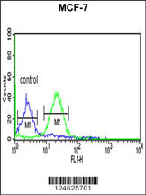 GPHN Antibody (Center) (Cat. APC00055G) flow cytometric analysis of MCF-7 cells (right histogram) compared to a negative control cell (left histogram).FITC-conjugated goat-anti-rabbit secondary antibodies were used for the analysis. |