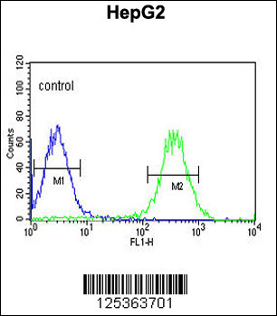 ARSI Antibody (C-term) (Cat. APR15075G) flow cytometric analysis of HepG2 cells (right histogram) compared to a negative control cell (left histogram).FITC-conjugated goat-anti-rabbit secondary antibodies were used for the analysis. |
