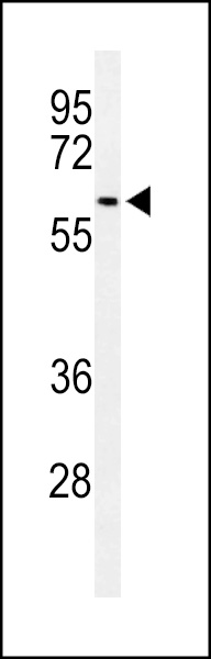 Western blot analysis of SNX27 Antibody (Center) (Cat. AMM07919G) in 293 cell line lysates (35ug/lane). SNX27 (arrow) was detected using the purified Pab. |