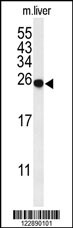 Western blot analysis of SPR Antibody (C-term) (Cat. APR07186G) in mouse liver tissue lysates (35ug/lane). SPR (arrow) was detected using the purified Pab. |