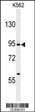 Western blot analysis of DLL4 Antibody (C-term) (Cat. APR11755G) in K562 cell line lysates (35ug/lane). DLL4 (arrow) was detected using the purified Pab.