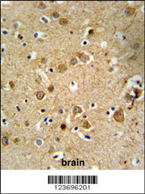 DLL4 Antibody (C-term) (Cat. APR11755G) IHC analysis in formalin fixed and paraffin embedded brain tissue followed by peroxidase conjugation of the secondary antibody and DAB staining. This data demonstrates the use of the DLL4 Antibody (C-term) for immunohistochemistry. Clinical relevance has not been evaluated.