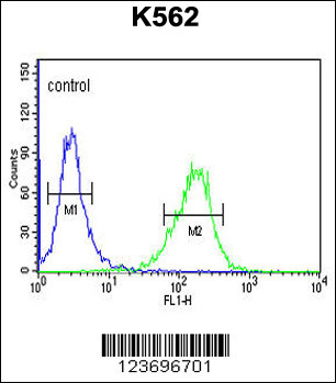 DLL4 Antibody (C-term) (Cat. APR11755G) flow cytometric analysis of K562 cells (right histogram) compared to a negative control cell (left histogram).FITC-conjugated goat-anti-rabbit secondary antibodies were used for the analysis. |