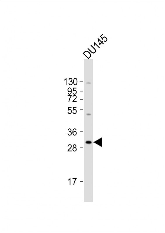 Anti-BASP1 Antibody (Center) at 1:2000 dilution + DU145 whole cell lysate Lysates/proteins at 20 μg per lane. Secondary Goat Anti-Rabbit IgG, (H+L), Peroxidase conjugated at 1/10000 dilution. Predicted band size : 23 kDa Blocking/Dilution buffer: 5% NFDM/TBST.