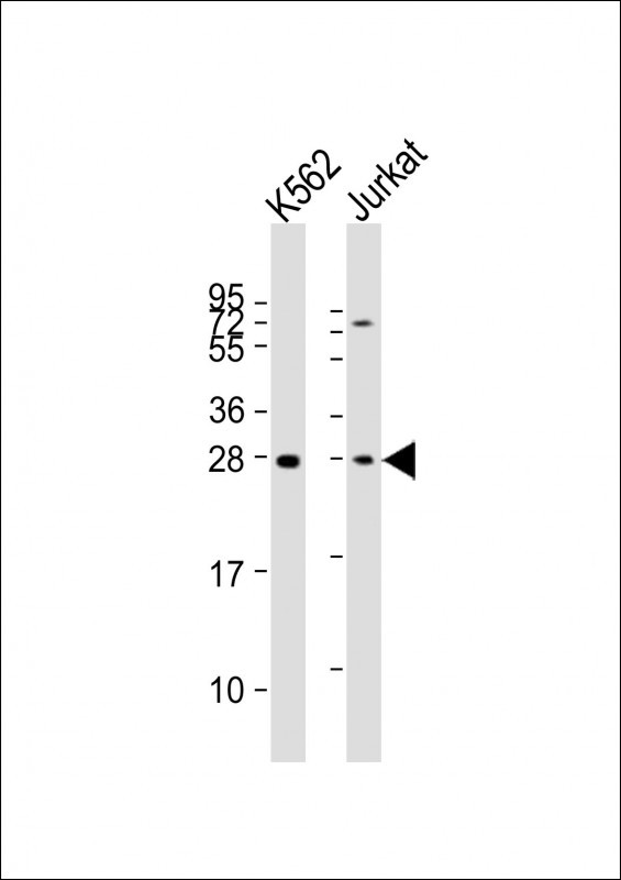 All lanes : Anti-BASP1 Antibody (Center) at 1:2000 dilution Lane 1: K562 whole cell lysates Lane 2: Jurkat whole cell lysates Lysates/proteins at 20 μg per lane. Secondary Goat Anti-Rabbit IgG, (H+L), Peroxidase conjugated at 1/10000 dilution. Predicted band size : 23 kDa Blocking/Dilution buffer: 5% NFDM/TBST.