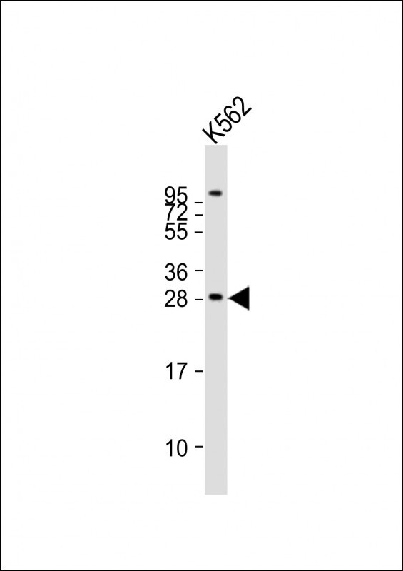 Anti-BASP1 Antibody (Center)at 1:2000 dilution + K562 whole cell lysates Lysates/proteins at 20 μg per lane. Secondary Goat Anti-Rabbit IgG, (H+L), Peroxidase conjugated at 1/10000 dilution. Predicted band size : 23 kDa Blocking/Dilution buffer: 5% NFDM/TBST. |