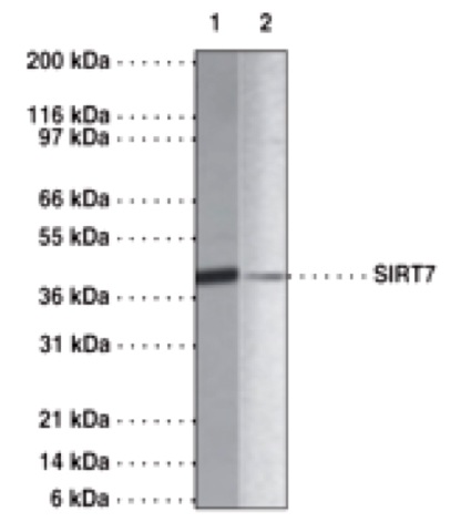 The sirtuins represent a distinct class of trichostatin A-insensitive lysyl-deacetylases (class III HDACs) and have been shown to catalyze a reaction that couples lysine deacetylation to the formation of nicotinamide and O-acetyl-ADP-ribose from NAD+ and the abstracted acetyl group. SIRT7 is a member of this family of proteins and is present in prokaryotes and eukaryotes. All SIR2-like proteins have a sirtuin core domain, which contains a series of sequence motifs conserved in organisms ranging from bacteria to humans. Bacterial, yeast, and mammalian sirtuins are able to metabolize NAD+ and several act as mono-ADP-ribosyltransferases. The enzymatic function of sirtuins is not yet completely understood but as mentioned above, recent reports of histone-activated SIR2-mediated NAD+ metabolism and NAD+-activated SIR2-mediated histone deacetylation s μggest a possible coupled reciprocal activation mechanism involving interactions of SIR2 with NAD+ and the N-ε-acetyl-lysine groups of acetylated histone.