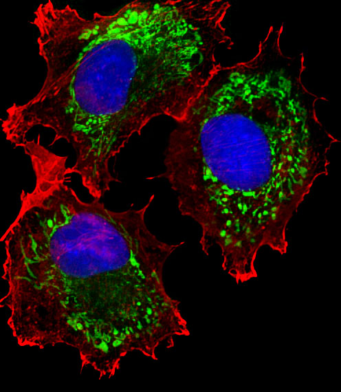 Fluorescent image of MCF-7 cells stained with ALDH6A1 Antibody ( APG01785G). APG01785G was diluted at 1:25 dilution. An Alexa Fluor? 488-conjugated goat anti-mouse lgG at 1:400 dilution was used as the secondary antibody (green). DAPI was used to stain the cell nuclear (blue). Cytoplasmic actin was counterstained with Alexa Fluor? 555 conjugated with Phalloidin (red).