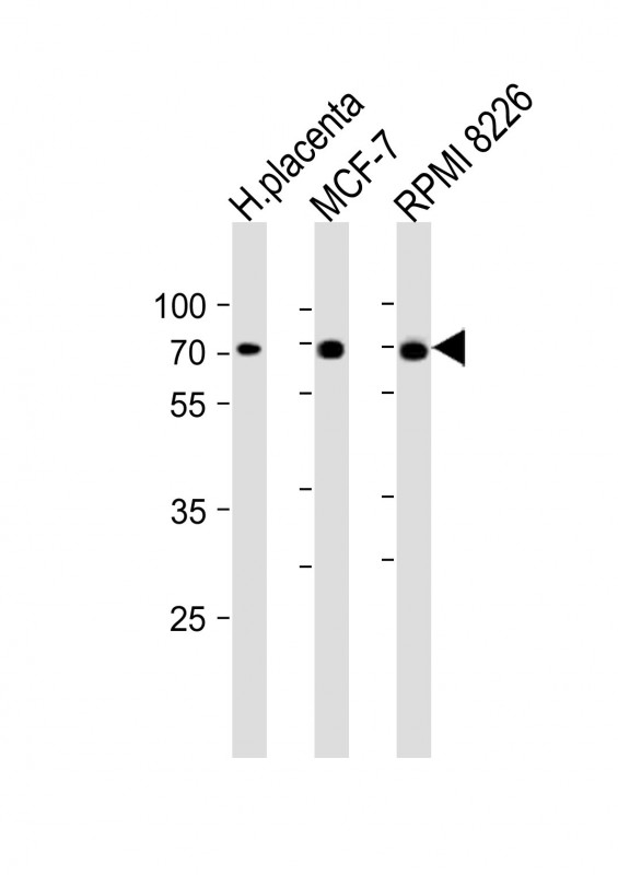 All lanes : Anti-RPS6KB2 Antibody at 1:1000 dilution Lane 1: human placenta lysate Lane 2: MCF-7 whole cell lysate Lane 3: RPMI 8226 whole cell lysate Lysates/proteins at 20 μg per lane. Secondary Goat Anti-mouse IgG, (H+L), Peroxidase conjugated at 1/10000 dilution. Predicted band size : 53 kDa Blocking/Dilution buffer: 5% NFDM/TBST.