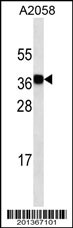 LGALS3 Antibody (C-term) (Cat. AMM06264G) western blot analysis in A2058 cell line lysates (35μg/lane).This demonstrates the LGALS3 antibody detected the LGALS3 protein (arrow). |