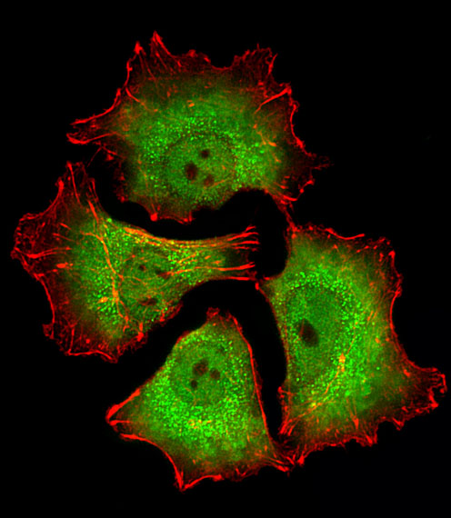 Fluorescent image of A549 cells stained with UCHL1 Antibody( APR13913G). APR13913G was diluted at 1:25 dilution. An Alexa Fluor? 488-conjugated goat anti-mouse lgG at 1:400 dilution was used as the secondary antibody (green). Cytoplasmic actin was counterstained with Alexa Fluor? 555 conjugated with Phalloidin (red).