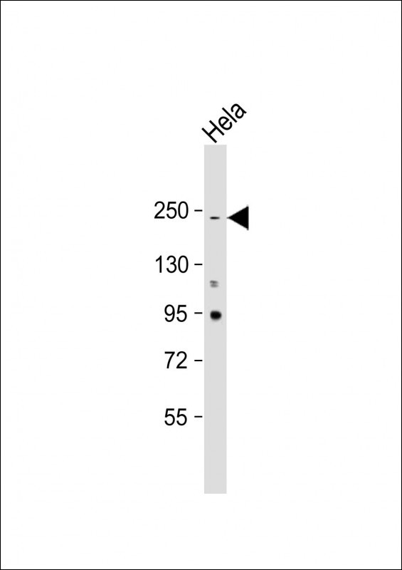 NOTCH3 Antibody (Q2306) (Cat. AMM06757G) western blot analysis in Hela cell line lysates (35μg/lane).This demonstrates the NOTCH3 antibody detected the NOTCH3 protein (arrow). |