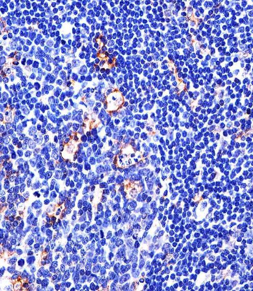 Immunohistochemical analysis of paraffin-embedded H. tonsil section using ITGB2 Antibody( APR16936G). APR16936G was diluted at 1:25 dilution. A undiluted biotinylated goat polyvalent antibody was used as the secondary, followed by DAB staining.
