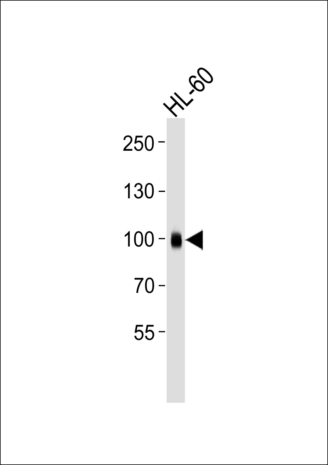 Western blot analysis of lysate from HL-60 cell line, using ITGB2 Antibody( APR16936G). APR16936G was diluted at 1:1000. A goat anti-mouse IgG H&L(HRP) at 1:3000 dilution was used as the secondary antibody. Lysate at 35μg.