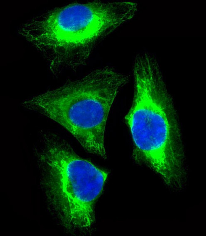 Immunofluorescent analysis of 4% paraformaldehyde-fixed, 0. 1% Triton X-100 permeabilized HeLa (human cervical epithelial adenocarcinoma cell line) cells labeling Pdx1 with AM2178B at 1/25 dilution, followed by Dylight? 488-conjugated goat anti-mouse IgG (NA166821) secondary antibody at 1/200 dilution (green). Immunofluorescence image showing cytoskeleton staining on HeLa cell line. The nuclear counter stain is DAPI (blue).