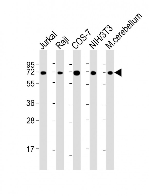 All lanes : Anti-ACHE Antibody (C-term) at 1:2000 dilution Lane 1: Jurkat whole cell lysate Lane 2: Raji whole cell lysate Lane 3: COS-7 whole cell lysate Lane 4: NIH/3T3 whole cell lysate Lane 5: mouse cerebellum lysate Lysates/proteins at 20 μg per lane. Secondary Goat Anti-mouse IgG, (H+L), Peroxidase conjugated at 1/10000 dilution. Predicted band size : 68 kDa Blocking/Dilution buffer: 5% NFDM/TBST.