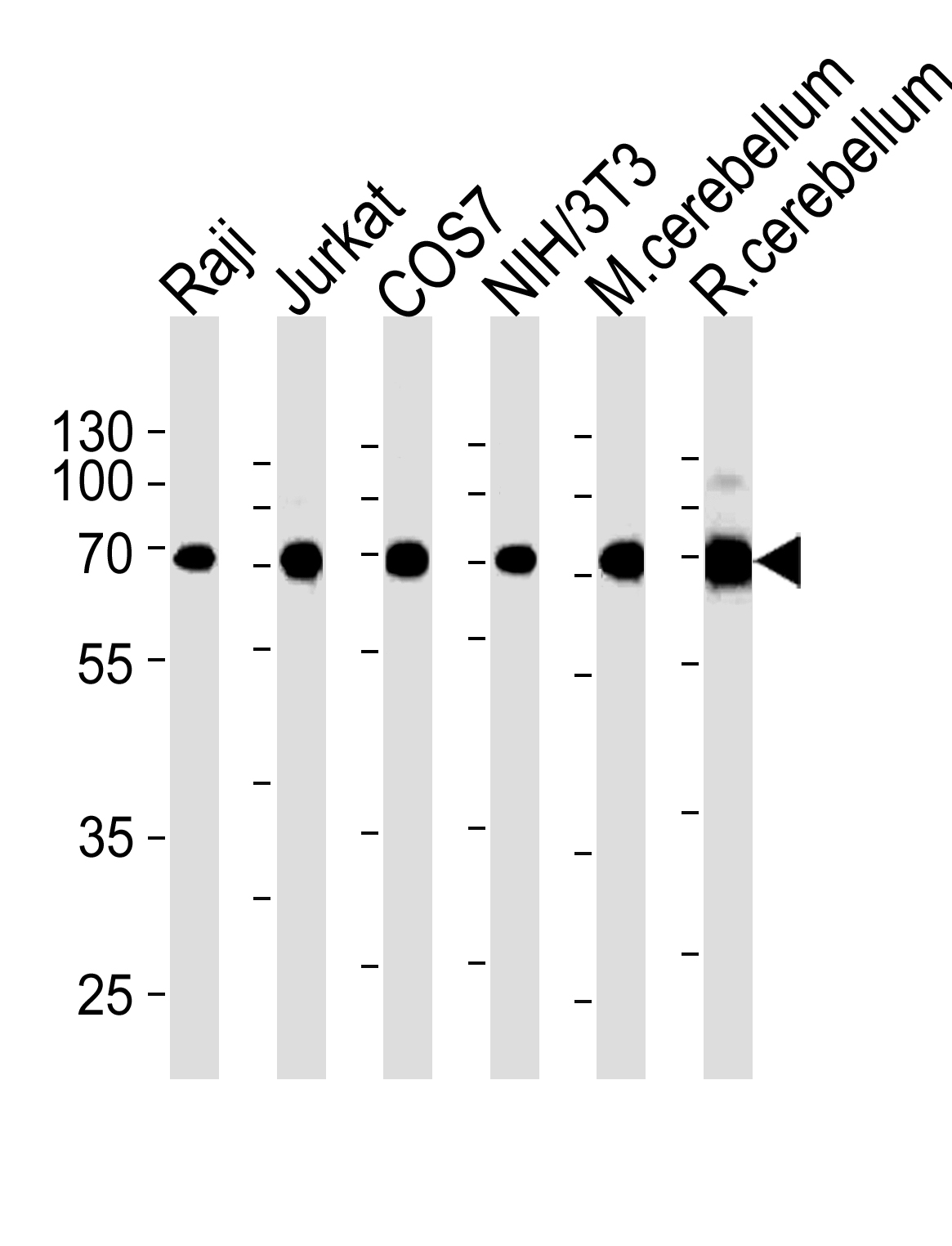 ACHE Antibody (C-term) (Cat. APG03116G) western blot analysis in Raji,Jurkat,COS7,mouse NIH/3T3 cell line and mouse cerebellum,rat cerebellum tissue lysates (35μg/lane).This demonstrates the ACHE antibody detected the ACHE protein (arrow). |