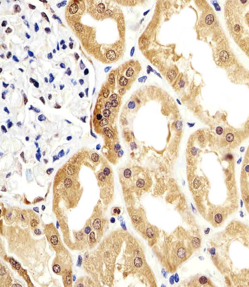 Immunohistochemical analysis of paraffin-embedded H. kideny section using ENO1 Antibody( APR07695G). APR07695G was diluted at 1:25 dilution. A undiluted biotinylated goat polyvalent antibody was used as the secondary, followed by DAB staining.