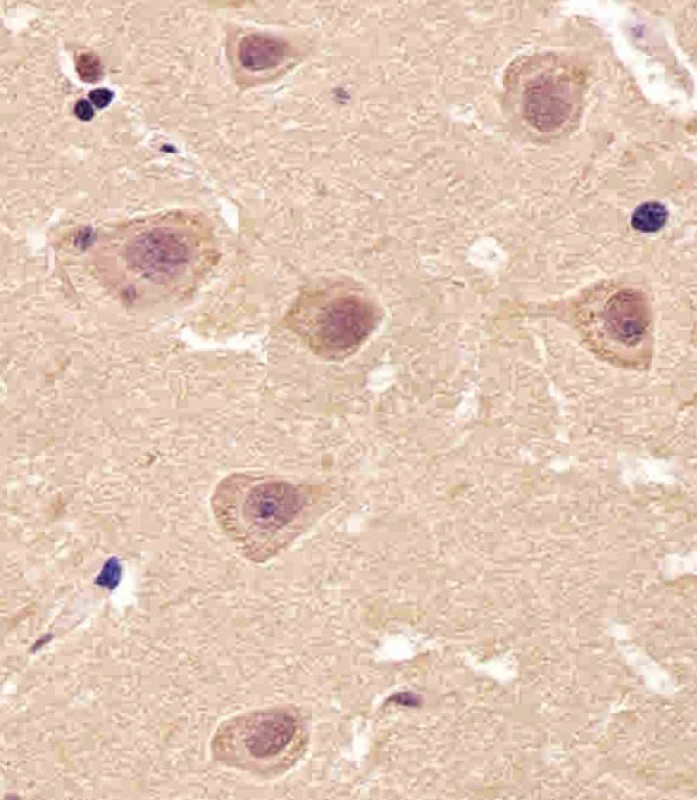 AM2212B staining PIN1 in human brain tissue sections by Immunohistochemistry (IHC-P - paraformaldehyde-fixed, paraffin-embedded sections). Tissue was fixed with formaldehyde and blocked with 3% BSA for 0. 5 hour at room temperature; antigen retrieval was by heat mediation with a citrate buffer (pH6). Samples were incubated with primary antibody (1/25) for 1 hours at 37°C. A undiluted biotinylated goat polyvalent antibody was used as the secondary antibody.