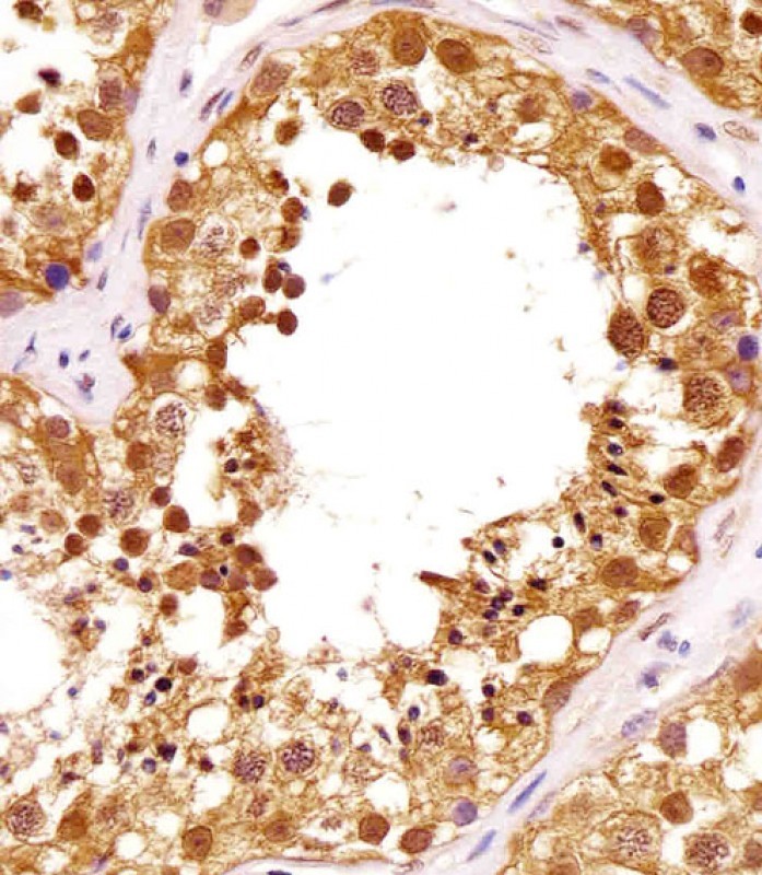 AM2212B staining PIN1 in human testis tissue sections by Immunohistochemistry (IHC-P - paraformaldehyde-fixed, paraffin-embedded sections). Tissue was fixed with formaldehyde and blocked with 3% BSA for 0. 5 hour at room temperature; antigen retrieval was by heat mediation with a citrate buffer (pH6). Samples were incubated with primary antibody (1/25) for 1 hours at 37°C. A undiluted biotinylated goat polyvalent antibody was used as the secondary antibody.