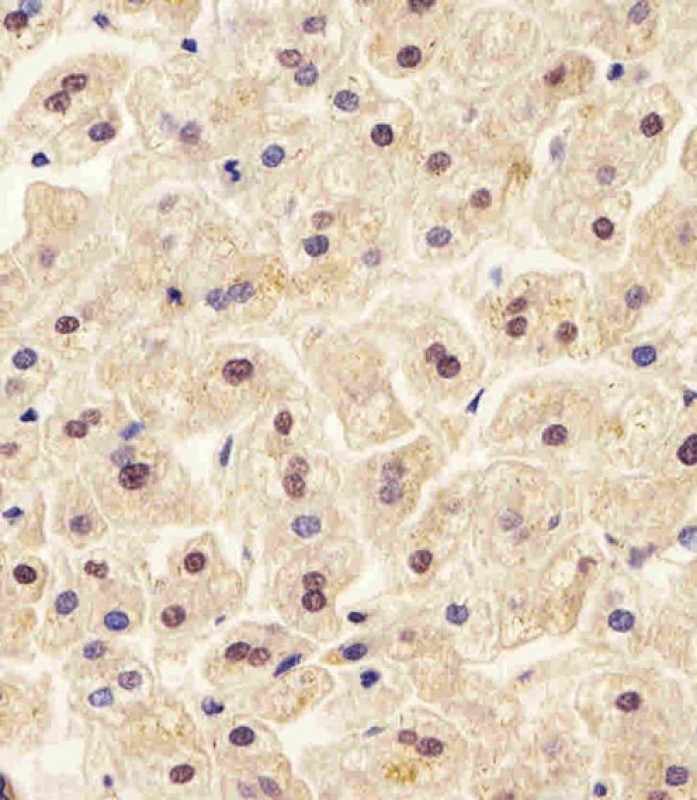 AW5186 staining PIN1 in human liver tissue sections by Immunohistochemistry (IHC-P - paraformaldehyde-fixed, paraffin-embedded sections). Tissue was fixed with formaldehyde and blocked with 3% BSA for 0. 5 hour at room temperature; antigen retrieval was by heat mediation with a citrate buffer (pH6). Samples were incubated with primary antibody (1/25) for 1 hours at 37°C. A undiluted biotinylated goat polyvalent antibody was used as the secondary antibody. |
