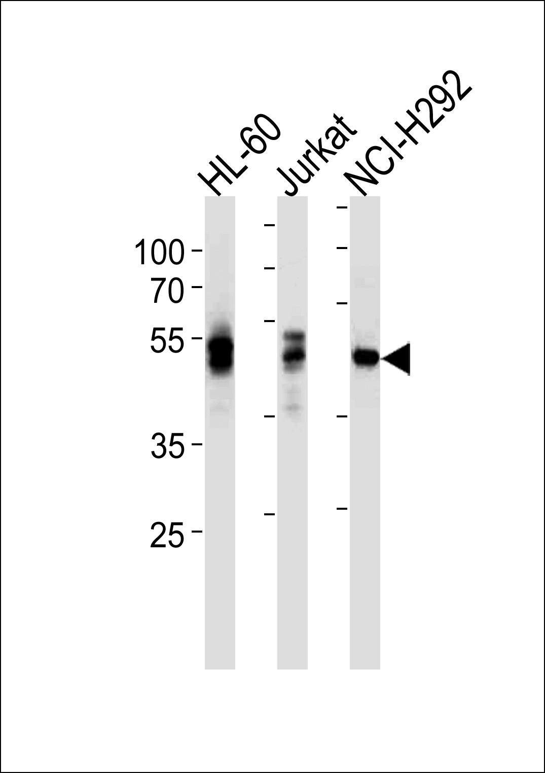 LCK Antibody(Cat. APR17165G) western blot analysis in HL-60,Jurkat,NCI-H292 cell line lysates (35μg/lane).This demonstrates the LCK antibody detected the LCK protein (arrow). |