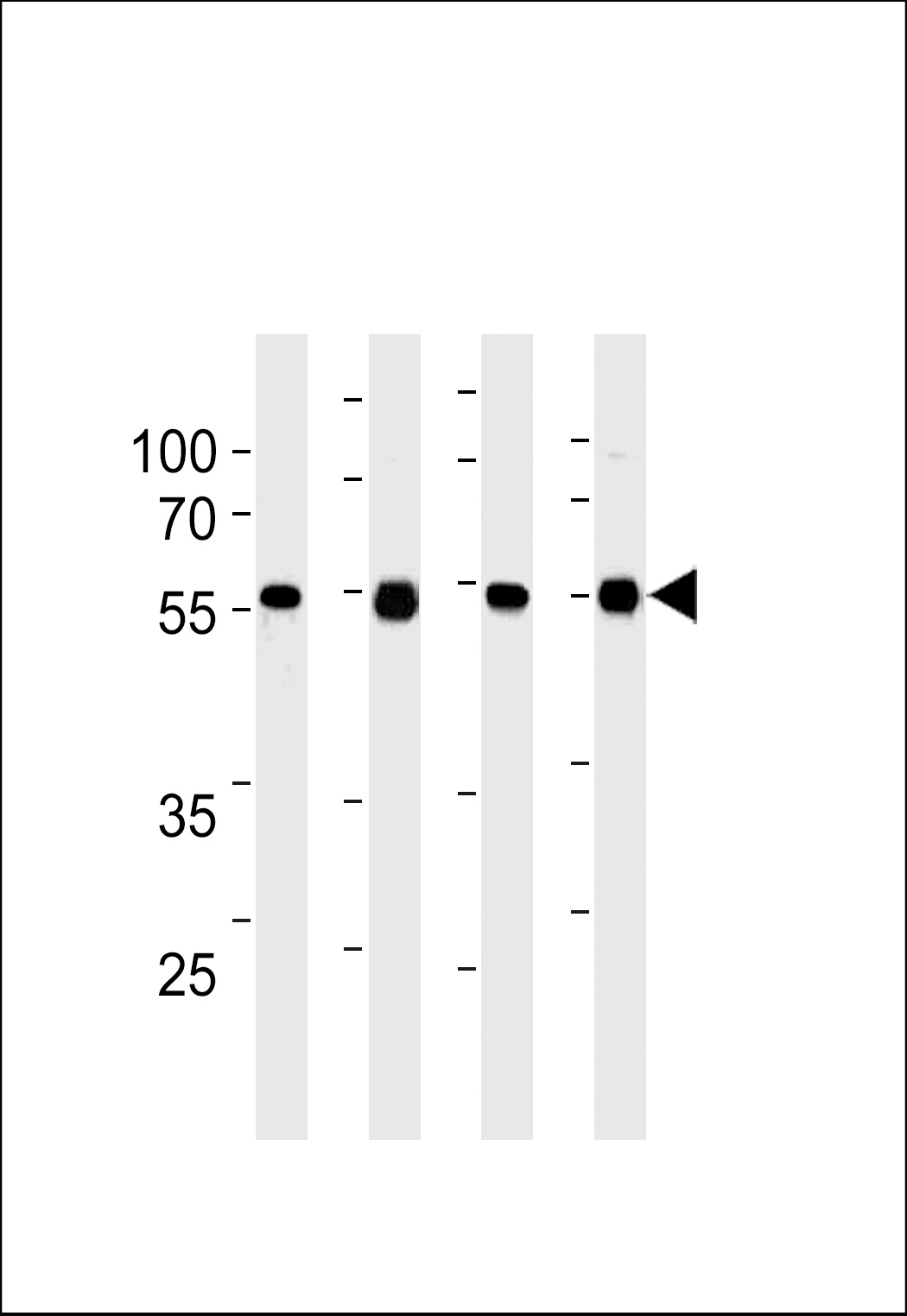 TPIPb Antibody (C-term)(Cat. AMM08297G) western blot analysis in 293,A431,A2058,mouse NIH/3T3 cell line lysates (35μg/lane).This demonstrates the TPIPb antibody detected the TPIPb protein (arrow). |