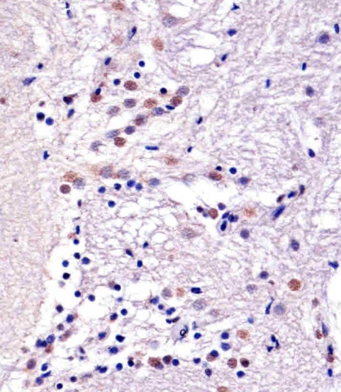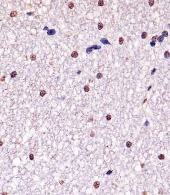 AW5192 staining YY1 in Rat brain tissue sections by Immunohistochemistry (IHC-P - paraformaldehyde-fixed, paraffin-embedded sections). Tissue was fixed with formaldehyde and blocked with 3% BSA for 0. 5 hour at room temperature; antigen retrieval was by heat mediation with a citrate buffer (pH6). Samples were incubated with primary antibody (1/25) for 1 hours at 37°C. A undiluted biotinylated goat polyvalent antibody was used as the secondary antibody. |