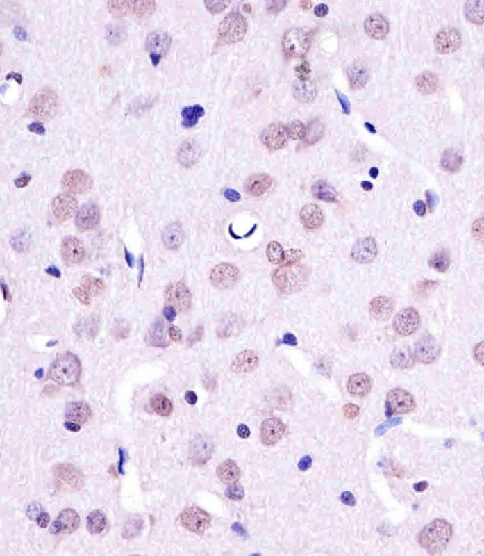 AW5192 staining YY1 in Monkey brain tissue sections by Immunohistochemistry (IHC-P - paraformaldehyde-fixed, paraffin-embedded sections). Tissue was fixed with formaldehyde and blocked with 3% BSA for 0. 5 hour at room temperature; antigen retrieval was by heat mediation with a citrate buffer (pH6). Samples were incubated with primary antibody (1/25) for 1 hours at 37°C. A undiluted biotinylated goat polyvalent antibody was used as the secondary antibody.