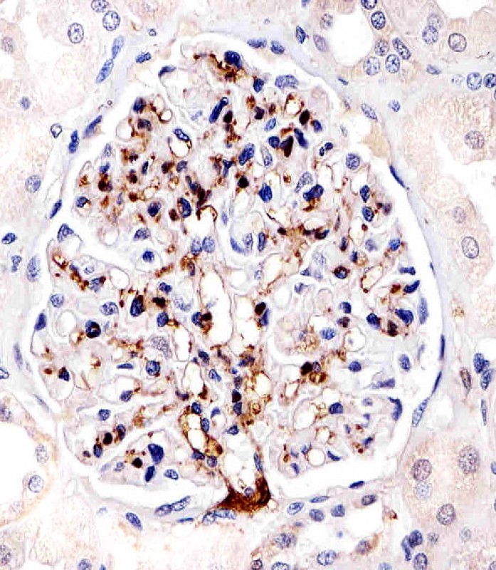 Immunohistochemical analysis of paraffin-embedded H. kidney section using FABP4 Antibody( AM2235B). AM2235B was diluted at 1:25 dilution. A undiluted biotinylated goat polyvalent antibody was used as the secondary, followed by DAB staining.