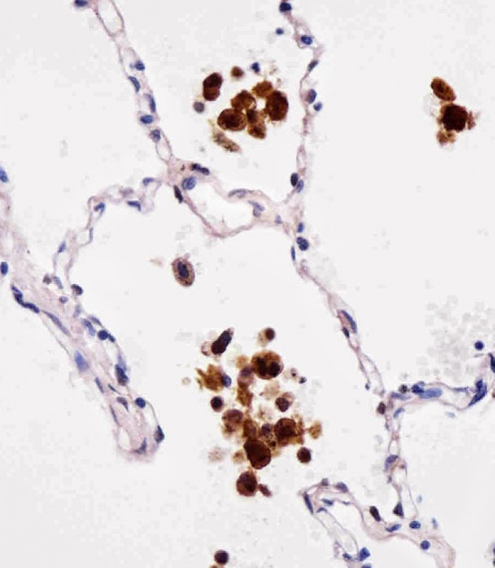 Immunohistochemical analysis of paraffin-embedded H. lung section using FABP4 Antibody( AM2235B). AM2235B was diluted at 1:25 dilution. A undiluted biotinylated goat polyvalent antibody was used as the secondary, followed by DAB staining.