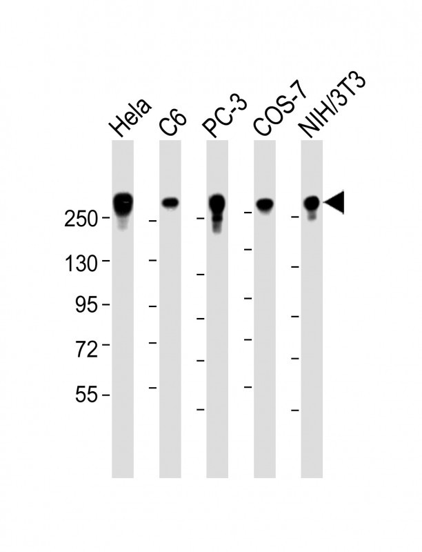All lanes : Anti-FLNA Antibody at 1:4000 dilution Lane 1: Hela whole cell lysate Lane 2: C6 whole cell lysate Lane 3: PC-3 whole cell lysate Lane 4: COS-7 whole cell lysate Lane 5: NIH/3T3 whole cell lysate Lysates/proteins at 20 μg per lane. Secondary Goat Anti-mouse IgG, (H+L), Peroxidase conjugated at 1/10000 dilution. Predicted band size : 280 kDa Blocking/Dilution buffer: 5% NFDM/TBST.