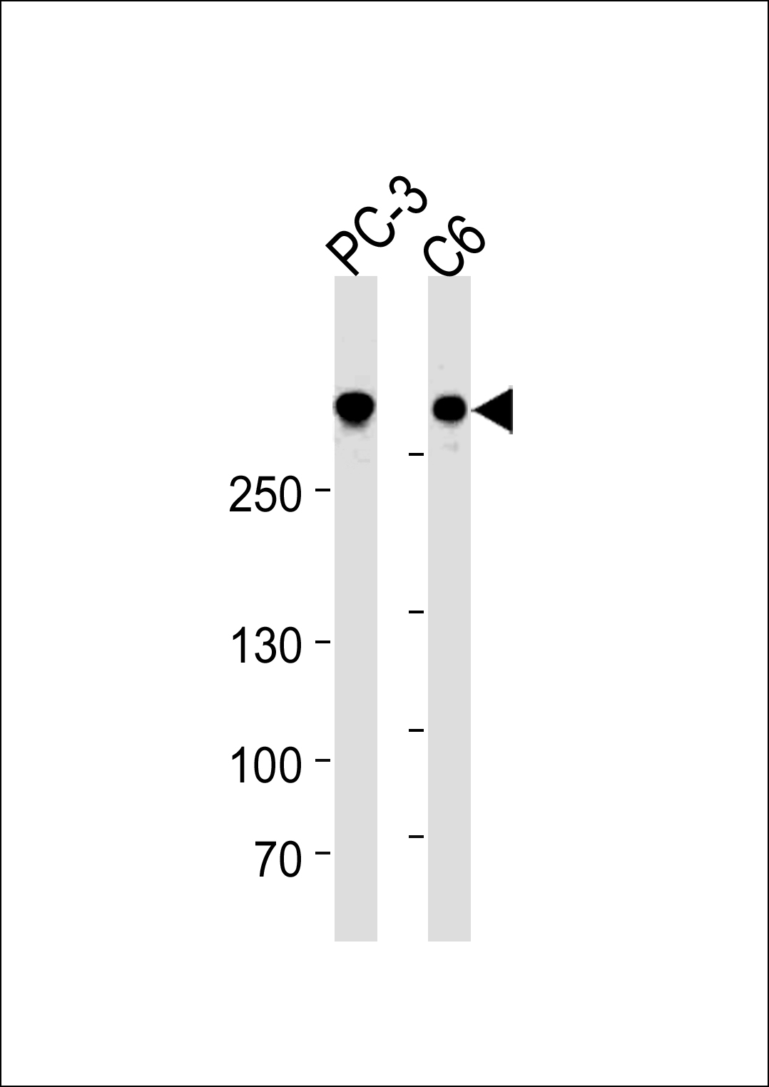 FLNA Antibody (Cat. APR14335G) western blot analysis in PC-3 and C6 cell line lysates (35μg/lane).This demonstrates the FLNA antibody detected the FLNA protein (arrow). |