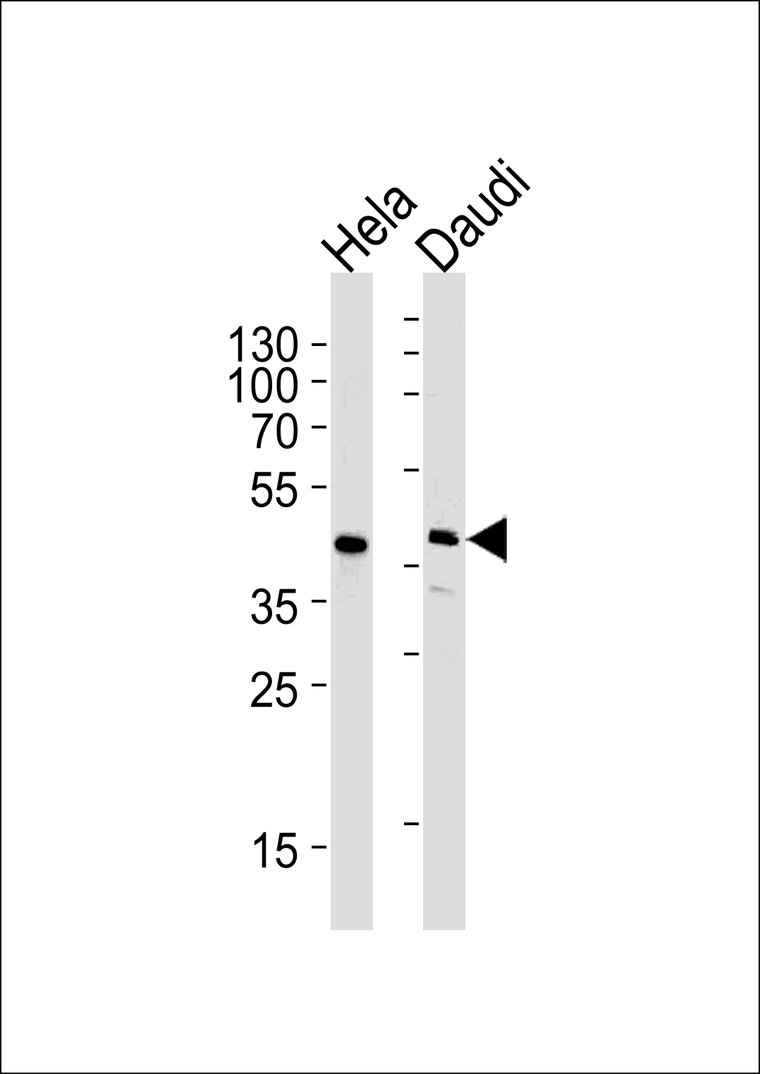 Western blot analysis of lysates from Hela,Daudi cell line (from left to right),using CREB3L4 Antibody (monoclonal) (M01) (Cat. APR10696G).APR10696G was diluted at 1:1000 at each lane. A goat anti-mouse IgG H&L(HRP) at 1:3000 dilution was used as the secondary antibody.Lysates at 35μg per lane. |
