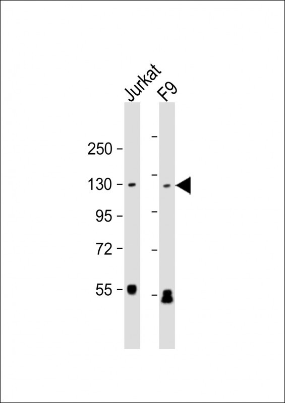 All lanes : Anti-SIRT1 Antibody at 1:1000 dilution Lane 1: Jurkat whole cell lysate Lane 2: F9 whole cell lysate Lysates/proteins at 20 μg per lane. Secondary Goat Anti-mouse IgG, (H+L), Peroxidase conjugated at 1/10000 dilution. Predicted band size : 82 kDa Blocking/Dilution buffer: 5% NFDM/TBST.