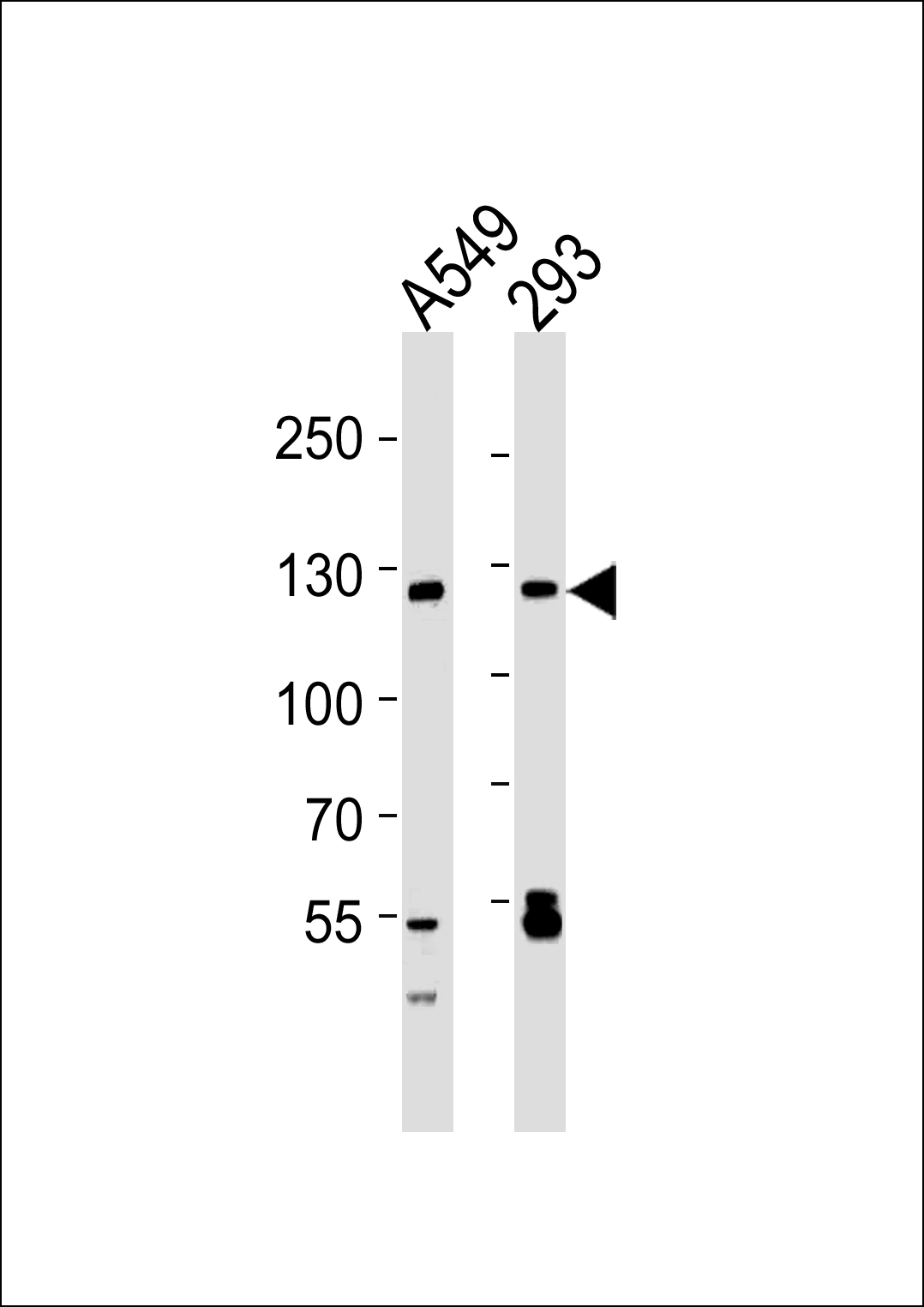 Western blot analysis of lysates from A549, 293 cell line (from left to right), using RPS6KB2 Antibody (Cat. APR09944G). APR09944G was diluted at 1:1000 at each lane. A goat anti-mouse IgG H&L(HRP) at 1:3000 dilution was used as the secondary antibody. Lysates at 35μg per lane. |