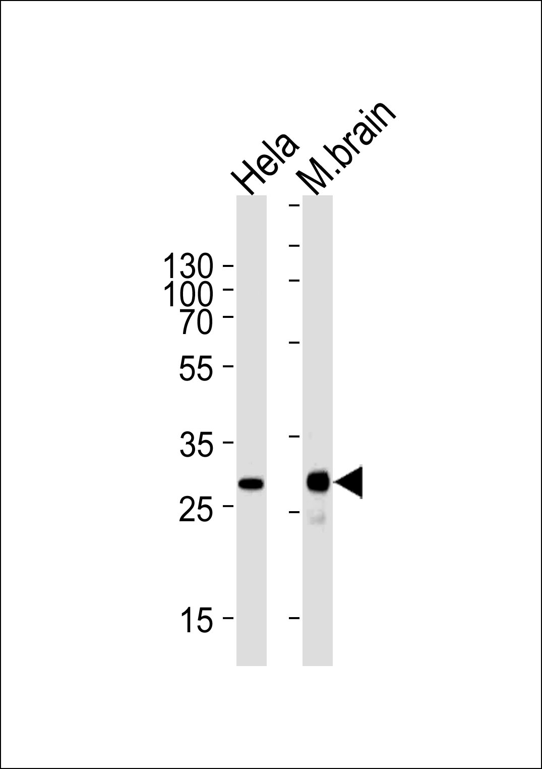 Western blot analysis of lysates from Hela cell line and mouse brain tissue lysate (from left to right) using CDK5 Antibody (Cat. APG02513G). APG02513G was diluted at 1:1000 at each lane. A goat anti-mouse IgG H&L(HRP) at 1:3000 dilution was used as the secondary antibody. Lysates at 35μg per lane. |