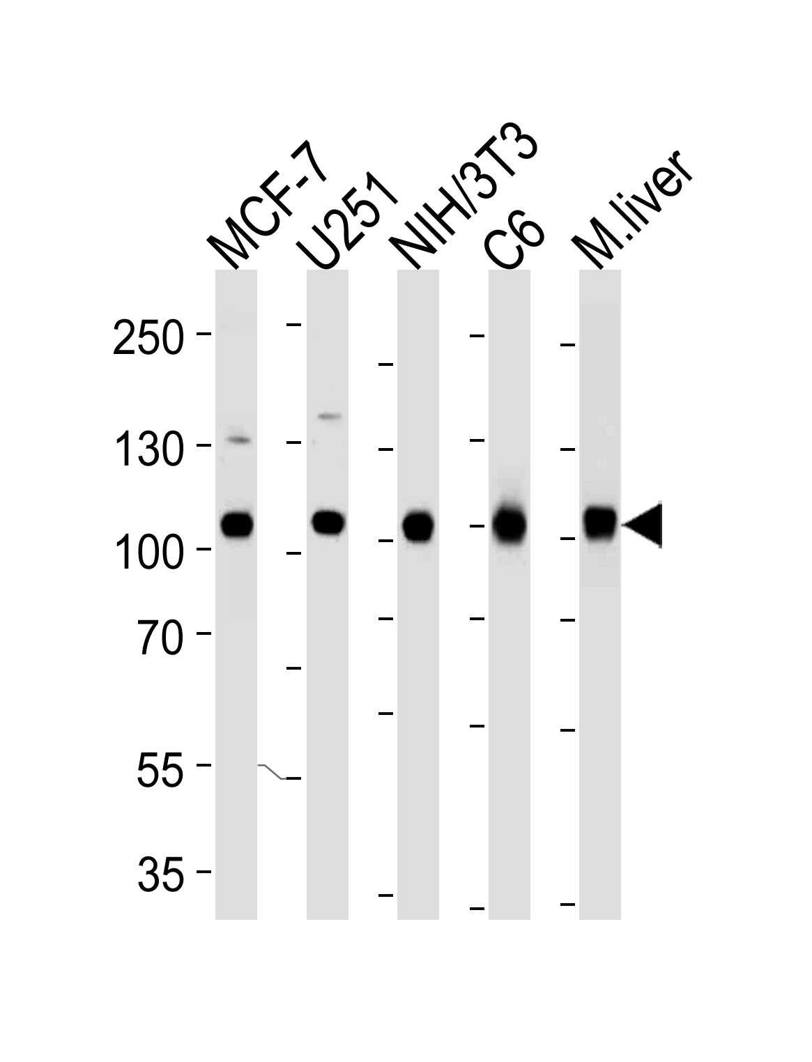 Western blot analysis of lysates from MCF-7, U251, mouse NIH/3T3, rat C6 cell line and mouse liver tissue lysate (from left to right) using VCP Antibody (Cat. APR10678G). APR10678G was diluted at 1:1000 at each lane. A goat anti-mouse IgG H&L(HRP) at 1:3000 dilution was used as the secondary antibody. Lysates at 35μg per lane. |