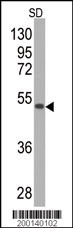 Western blot analysis of anti-SOD2 Monoclonal Antibody (Cat. APR10198G) by SOD2-GST fusion protein (GST MW=26 kD. SOD2-GST fusion protein (arrow) was detected using the purified Mab. (1:2000) |