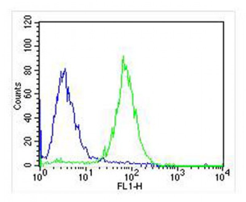 Overlay histogram showing SH-SY5Y cells stained with APR08849G (green line). The cells were fixed with 2% paraformaldehyde (10 min) and then permeabilized with 90% methanol for 10 min. The cells were then icubated in 2% bovine serum albumin to block non-specific protein-protein interactions followed by the antibody (APR08849G, 1:25 dilution) for 60 min at 37?C. The secondary antibody used was Goat-Anti-Mouse IgG, DyLight? 488 Conjugated Highly Cross-Adsorbed(NA168821)) at 1/400 dilution for 40 min at 37?C. Isotype control antibody (blue line) was mouse IgG1 (1μg/1x10^6 cells) used under the same conditions. Acquisition of >10, 000 events was performed.