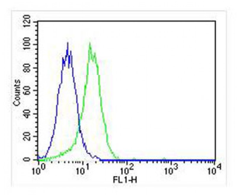 Overlay histogram showing U-87MG cells stained with AMM08769G (green line). The cells were fixed with 2% paraformaldehyde (10 min). The cells were then icubated in 2% bovine serum albumin to block non-specific protein-protein interactions followed by the antibody (AMM08769G, 1:25 dilution) for 60 min at 37?C. The secondary antibody used was Goat-Anti-mouse IgG, DyLight? 488 Conjugated Highly Cross-Adsorbed(NA168821) at 1/400 dilution for 40 min at 37?C. Isotype control antibody (blue line) was rabbit IgG (1μg/1x10^6 cells) used under the same conditions. Acquisition of >10, 000 events was performed. |