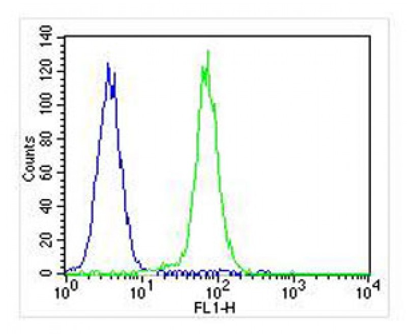 Overlay histogram showing K562 cells stained with APG02512G (green line). The cells were fixed with 2% paraformaldehyde (10 min) and then permeabilized with 90% methanol for 10 min. The cells were then icubated in 2% bovine serum albumin to block non-specific protein-protein interactions followed by the antibody (APG02512G, 1:25 dilution) for 60 min at 37?C. The secondary antibody used was Goat-Anti-Mouse IgG, DyLight? 488 Conjugated Highly Cross-Adsorbed(NA168821)) at 1/400 dilution for 40 min at 37?C. Isotype control antibody (blue line) was mouse IgG1 (1μg/1x10^6 cells) used under the same conditions. Acquisition of >10, 000 events was performed.