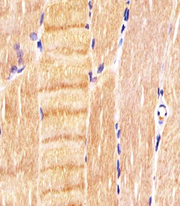 APG02512G staining CDK5 in human skeletal muscle sections by Immunohistochemistry (IHC-P - paraformaldehyde-fixed, paraffin-embedded sections). Tissue was fixed with formaldehyde and blocked with 3% BSA for 0. 5 hour at room temperature; antigen retrieval was by heat mediation with a citrate buffer (pH6). Samples were incubated with primary antibody (1/25) for 1 hours at 37°C. A undiluted biotinylated goat polyvalent antibody was used as the secondary antibody. |