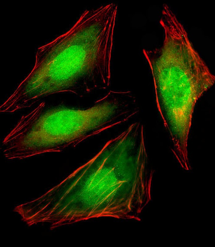 Immunofluorescent analysis of 4% paraformaldehyde-fixed, 0. 1% Triton X-100 permeabilized HeLa (human cervical epithelial adenocarcinoma cell line) cells labeling VCP with APR10677G at 1/25 dilution, followed by Dylight? 488-conjugated goat anti-mouse IgG (NA166821) secondary antibody at 1/200 dilution (green). Immunofluorescence image showing cytoplasm and nucleus staining on HeLa cell line. Cytoplasmic actin is detected with Dylight? 554 Phalloidin (PD18466410) at 1/100 dilution (red).