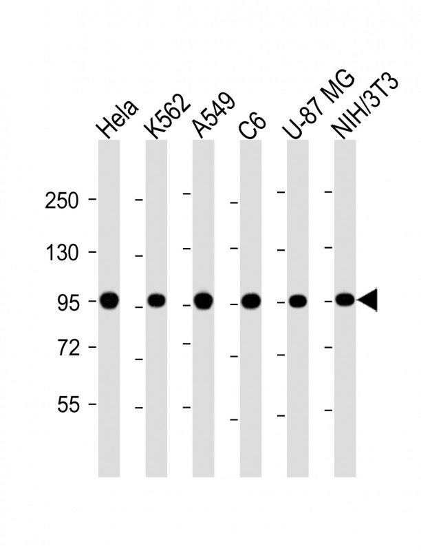 All lanes : Anti-VCP Antibody at 1:4000 dilution Lane 1: Hela whole cell lysate Lane 2: K562 whole cell lysate Lane 3: A549 whole cell lysate Lane 4: C6 whole cell lysate Lane 5: U-87 MG whole cell lysate Lane 6: NIH/3T3 whole cell lysate Lysates/proteins at 20 μg per lane. Secondary Goat Anti-mouse IgG, (H+L), Peroxidase conjugated at 1/10000 dilution. Predicted band size : 89 kDa Blocking/Dilution buffer: 5% NFDM/TBST. |